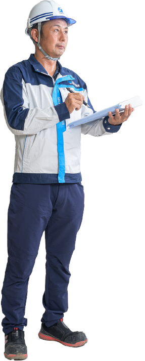 土木の積算→受注→工事管理(工程・品質・安全・原価)までを一貫して担当します。朝は現場集合・朝礼と作業打合せから始まり、進捗に合わせて現場管理や役所・社内との調整を行います。担当するものは道路・橋・下水・河川・港湾など、暮らしの基盤そのもの。構造物が完成した時にやりがいを強く感じます。災害時は要請に備え、即応体制で地域を支えます。